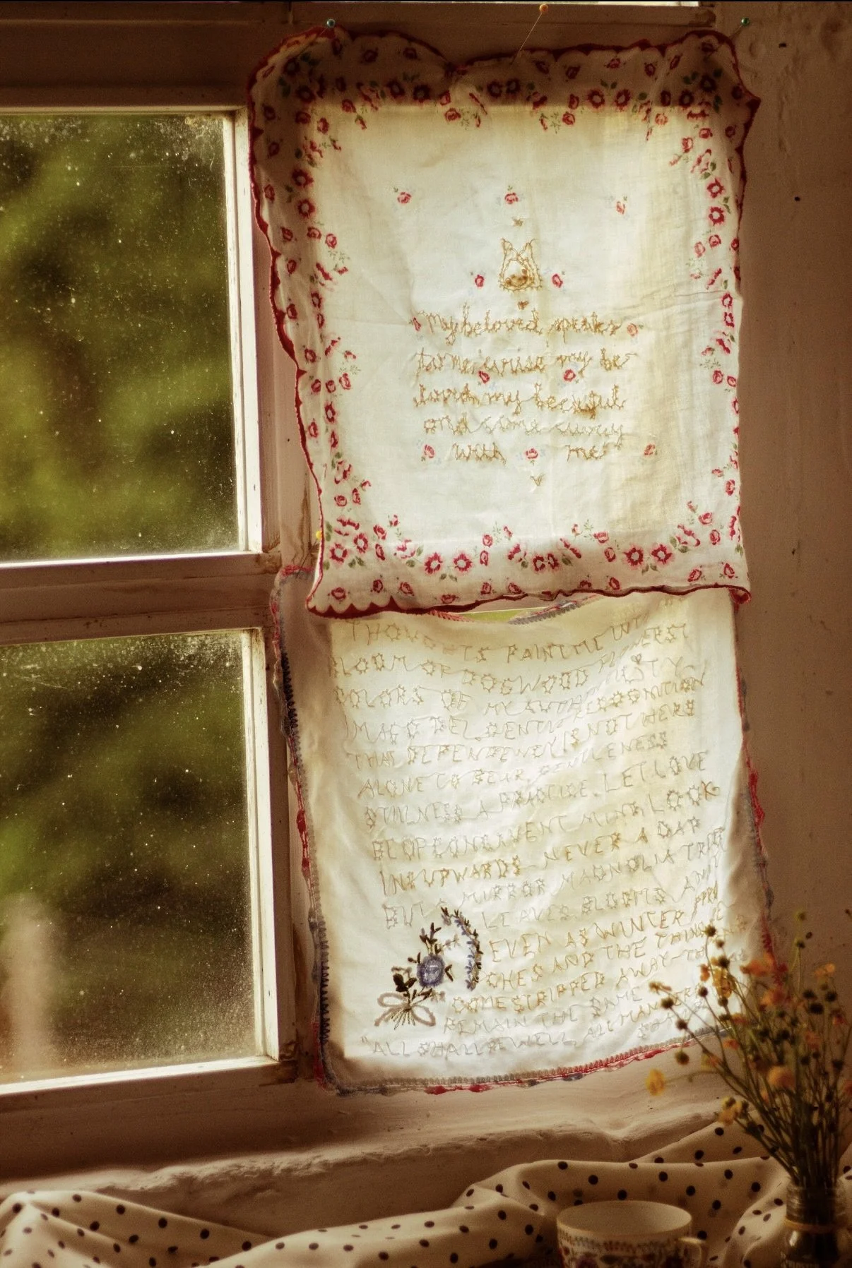What could I tell you about the art that I am making these days? Upon first glance, it probably seems slightly chaotic; a disjointed union of second-hand linens, oil paint, and prose. This choice of media is crucial in telling an authentic story…you have not been eating only peanut butter sandwiches all your life...have you..?